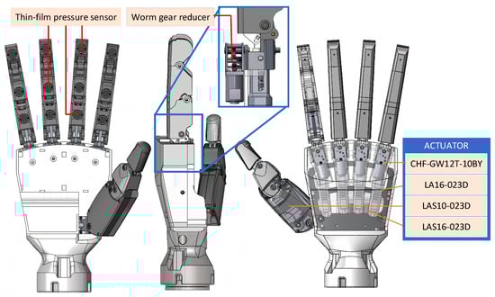 Schematic diagram of the overall structure of the prosthetic hand. The prosthetic hand has five fingers. Among them, the thumb is driven by the electric cylinder LAS10-023D, and the relative rotation of the palm and thumb is driven by LAS16-023D. The remaining four fingers are driven by the electric cylinder LA16-023D and the motor CHF-GW12T-10BY. Thin-film pressure sensors are evenly distributed on the three knuckles of the five fingers.