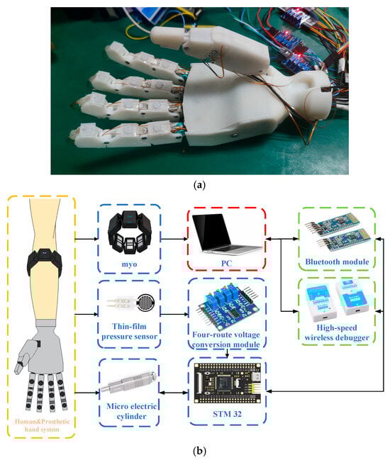 (a) The prototype of prosthetic hand. (b) Configuration of the prosthetic hand control platform. The eight-channel sEMG signals collected by myo is directly sent to the PC, which is mapped to the expected force by the improved TCN trained in the PC. Meanwhile, the force signal collected by the thin-film pressure sensor and the current displacement of the electric cylinder are collected by STM32 and sent to the PC through the wireless module. After processing the actual force, actual displacement and expected force, the PC obtains an expected displacement. It is sent to the STM32 through the wireless module, and the STM32 drives the electric cylinder to move.