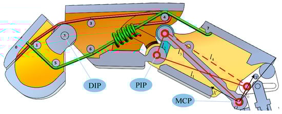 The relative rotation angle of the middle phalanx is consistent with the rotation angle corresponding to in Figure 7. Since the MCP joint and PIP joint are transmitted through a four-bar linkage, their angular relationship satisfies: