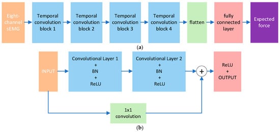 (a) The overall architecture of improved TCN. Input eight channels of sEMG signals and output the expected force. (b) Temporal convolutional block structure.