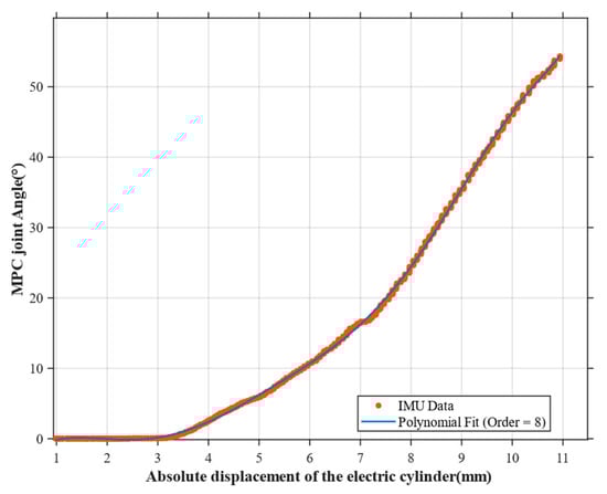 The movement of the proximal phalanx is accomplished by the electric cylinder driving the slider–rocker mechanism to drive the cam and thus push the phalanx. Therefore, there is a deterministic mapping relationship between its rotation angle and the absolute position of the push rod. We use inertial measurement unit (IMU) as the tool for verifying the model accuracy. The joint position data corresponding to different push rod elongations are collected by an IMU, and the functional relationship between the two obtained through fitting is as follows (Polynomial fitting order: 8, MSE: 0.065760, R2: 0.999775):