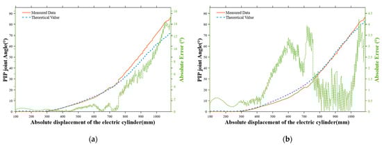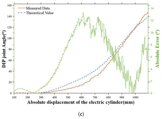 Based on the previously established kinematic mapping between the absolute position of the push rod and PIP joint angle, Figure 8a,b reveals the quantitative relationship between the push rod displacement and the PIP joint angle. Due to factors such as gaps during manufacturing and installation, as the absolute value displacement of the electric cylinder increases, the rotational error of the mapped PIP joint and the error of the theoretical model increase accordingly. Therefore, it is necessary to multiply the theoretical value by a coefficient k = 1.15 to reduce the absolute value error during control [19]. The modified equation is