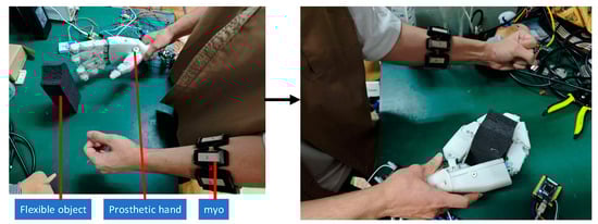 After the offline training of the EMG-to-force calibration model was completed, the subject wore the same Myo electromyographic acquisition device to collect real-time sEMG signals from target forearm muscles, at a sampling frequency of 100 Hz. The experimental scene of flexible grasping is shown in Figure 13. A pre-trained TNC model was used to map temporal sEMG features to continuous finger grasping force predictions in real time. These predicted forces served as real-time input commands for the control system.