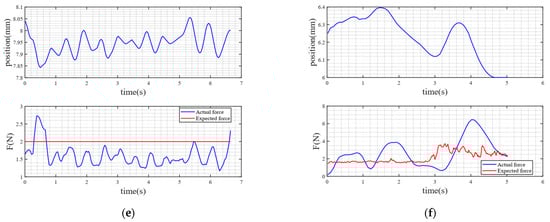The absolute displacement of the electric cylinder and the tracking of the actual force to the expected force in various modes. (a) LIA-MPC under constant force; (b) LIA-MPC under variable force; (c) AC under constant force; (d) AC under variable force; (e) LIA-PIP under constant force; (f) LIA-PIP under variable force.
