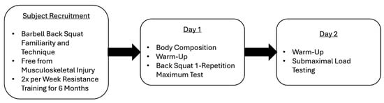 In this study, subjects reported to the Resistance Exercise, Physiology, and Sport Laboratory in a euhydrated and rested state for two visits separated by at least a week. On the first visit, subjects completed body composition testing, a warm-up, and a 1-repetition maximum (1RM) test on the barbell back squat. On the second visit, subjects completed the same warm-up, followed by seven sets of barbell back squat at 30%, 40%, 50%, 60%, 70%, 80%, and 90% 1RM. Throughout 1RM testing and submaximal loads, subjects had their linear velocity determined via linear position transducer and angular velocity via inertial measurement unit. Overall study design is presented in Figure 1.