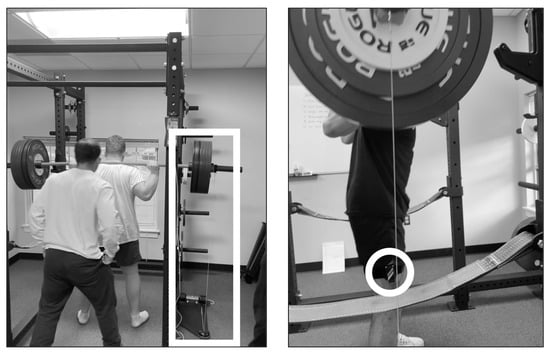 During the 1RM and submaximal testing, average linear velocity and angular velocity were measured for each repetition. Linear velocity was measured using a linear position transducer (Tendo Weightlifting Analyzer, TENDO Sports Machines, Trenchin, Slovak Republic) positioned directly beneath the right collar of the barbell with a retractable cord attached to the collar. The linear position transducer measured the change in displacement of the barbell (m) throughout the repetition over the time of the repetition (s). Angular velocity was measured using an inertial measurement unit (Output Sports, Dublin, Ireland) attached to the lateral aspect of the thigh at 2/3rd the distance between the greater trochanter and the lateral condyle of the femur. The inertial measurement unit measured the change in orientation (°) throughout the repetition over the time of the repetition (s). Both the linear position transducer [28,29] and inertial measurement unit [30] have demonstrated acceptable test–retest reliability. For both linear and angular velocity, the average of the entire concentric portion of each repetition was determined. For each set, the average of the two closest repetitions were chosen for analysis. Figure 2 presents the setup of the linear and angular velocity measurements during testing.