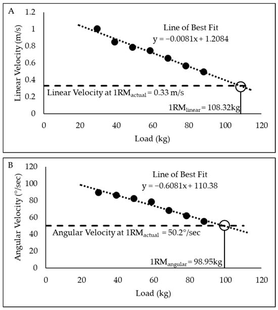 Load and velocity data from the submaximal testing were used to estimate 1RM using linear (1RMlinear) and angular (1RMangular) velocities. First, the seven submaximal loads and velocities were plotted. Then, the slope and intercept of the line of best fit were determined. Finally, the estimated 1RM was calculated by using the slope, intercept, and velocity data from the participants 1RMactual. This process was completed for linear and angular velocities. Figure 3 presents the 1RM estimation methodology for linear velocity and angular velocity using an example subject’s data.