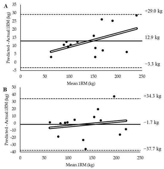 Bland–Altman plots showing the comparison between actual 1RM and (A) linear velocity-predicted 1RM and (B) angular velocity-predicted 1RM. Solid line represents the mean difference between variables with horizontal dashed lines representing the 95% confidence interval of the mean difference. Unfilled line represents the line of best fit.
