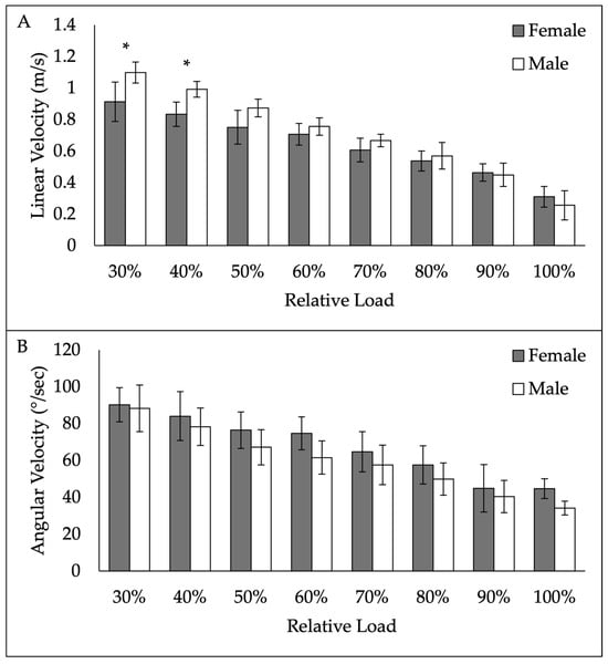Gender differences in linear velocity (A) and angular velocity (B) from 30% to 100% 1-repetition maximum. * denotes significant difference between genders.