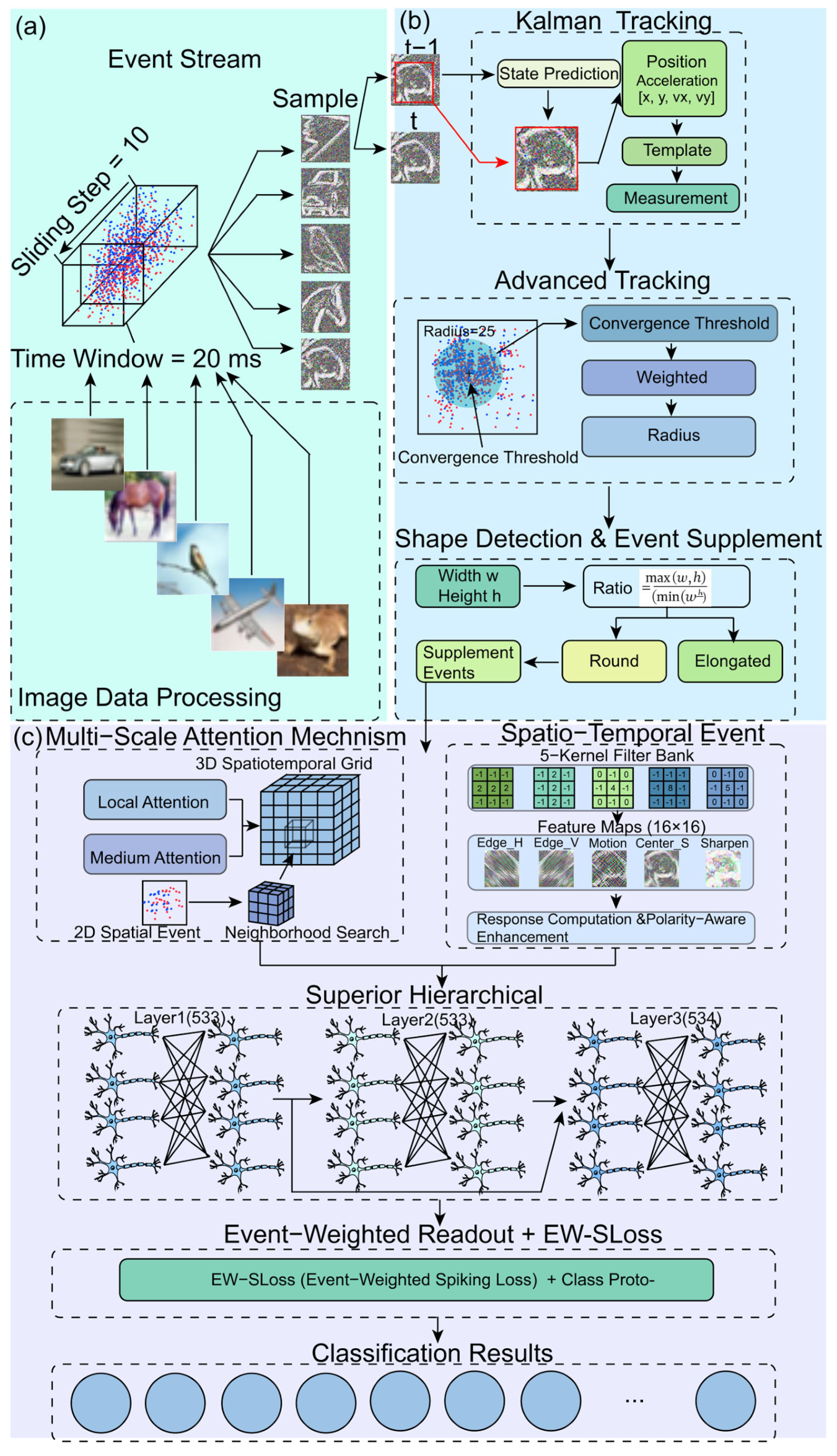 The extracted features are then processed by the hierarchical spiking network, which refines the tracking results across multiple layers and captures both fine-grained details and broader object dynamics. A distinguishing element of the framework is the Event Weighted Spiking Loss, which assigns higher importance to events with greater spatiotemporal relevance. Here, spatiotemporal relevance denotes the evidential strength of an event measured by three factors: closeness in time to neighbouring events within the current slice, coherence in space with the local motion pattern estimated from the discrete velocity and acceleration described in Equations (4) and (5), and consistency of polarity with the dominant local contrast. These factors are combined and normalised to produce an attention weight as formalised in Equations (9)–(12), and this weight both scales the synaptic input during inference and multiplies the per-event error in the loss defined in Equation (15). The Event Weighted Readout then aggregates the weighted responses with class prototypes to obtain the final classification, yielding a lightweight design that supports real-time event tracking with modest computational resources. Instrument note. Event data were acquired with a DAVIS346 event+frame camera (iniVation AG, Zurich, Switzerland); experiments used the vendor DV-Platform where applicable.