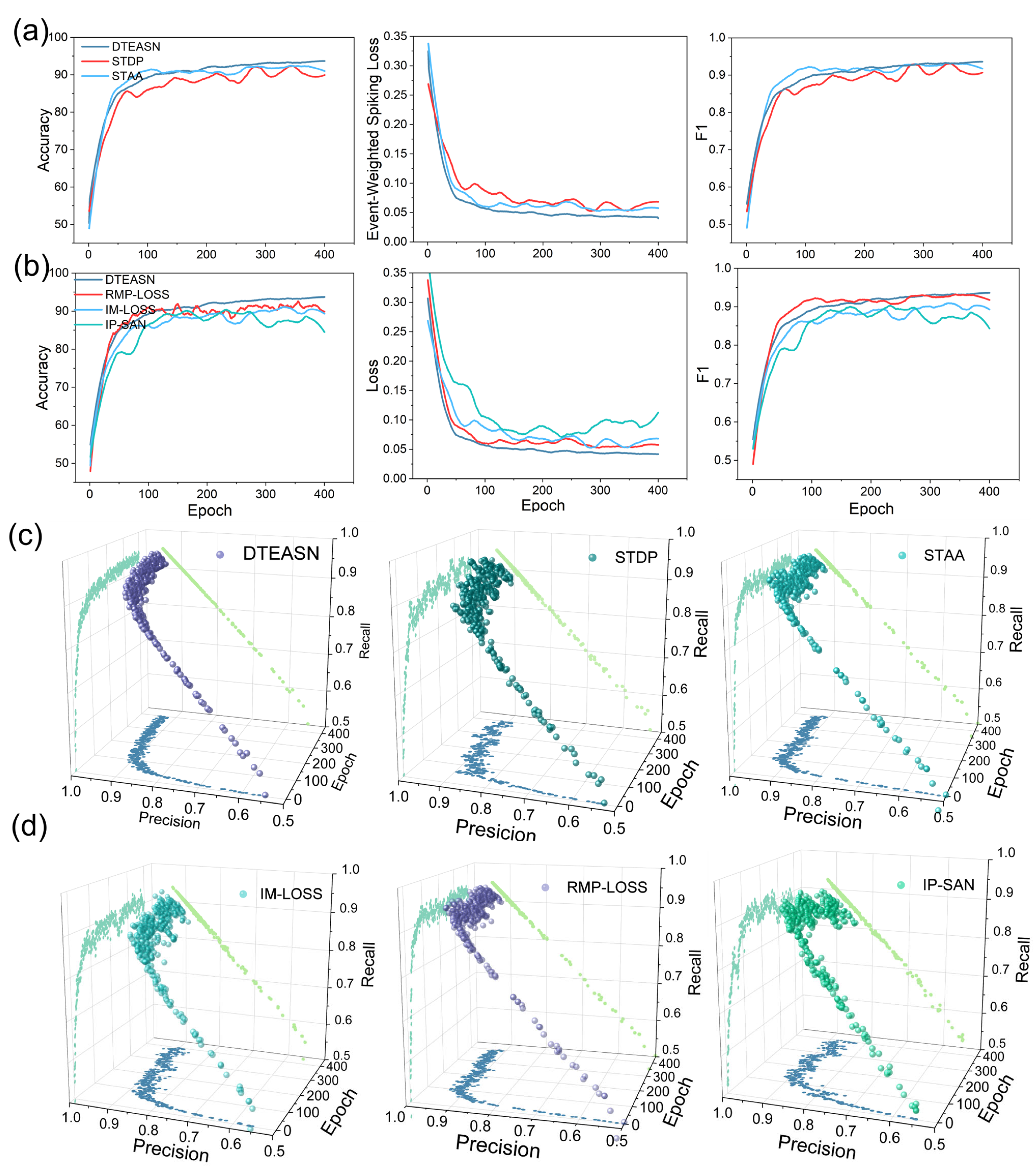 30], and aligns the processing with DVS signal characteristics via time-window slicing and polarity-aware operations. DTEASN incorporates a multi-scale, event-driven attention mechanism designed to focus on the most salient portions of the event stream, thereby enhancing feature extraction. Additionally, a spatio-temporal event convolver is introduced to optimise processing by capturing both spatial and temporal features. Another significant innovation is the Event-Weighted Spiking Loss (EW-SLoss), a loss function that enhances tracking accuracy by differentiating between relevant and irrelevant events and improving robustness to sensor noise. The framework also includes a lightweight event tracking mechanism to reduce computational burden and a custom synaptic connection rule to optimise information flow. We evaluate DTEASN on event-based recognition and tracking benchmarks, and report sensor-relevant system indicators (latency, event throughput (events/s), spike rate (spikes/s), memory footprint, and a simple energy proxy), showing superior performance in terms of accuracy, energy consumption, and computational efficiency compared with conventional methods. Classification uses the category sets defined by the benchmark datasets throughout the study, and species level labels are not considered.