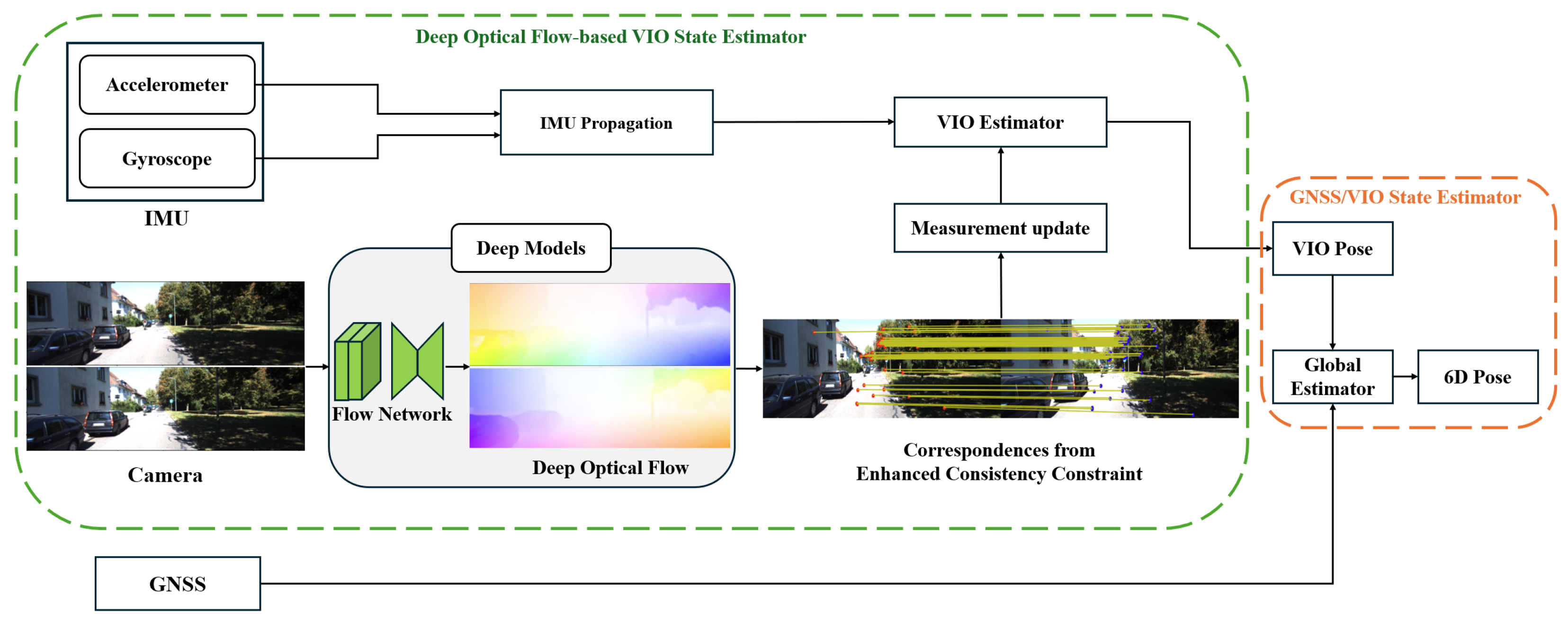 - An integrated framework combining a hybrid VIO approach employing deep networks with GNSS measurements is proposed. The enhanced consistency constraint is applied to the predicted optical flow to selectively extract high-confidence measurements, which are then incorporated into the VIO framework. The framework is applied to real sensor-based datasets, enhancing scalability through sensor fusion while maintaining general applicability.
