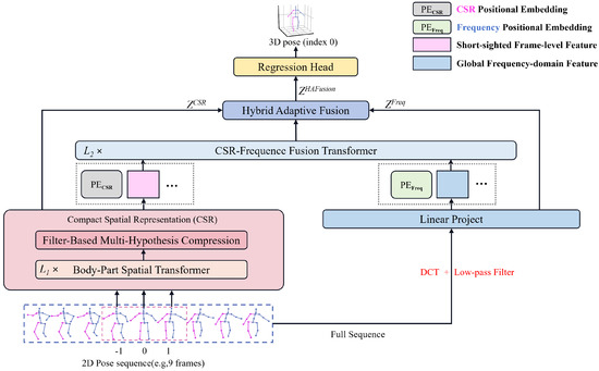 The 2D-to-3D lifting methods [1,2,3,4,5] are gaining prominence in 3D human pose estimation over data-heavy approaches [6,7,8,9,10] of directly extracting 3D poses from videos. However, the effectiveness of lifting-based methods is constrained by the quality of 2D pose detection. In addition, handling a large number of temporal features also incurs significant computational costs. In practice, 2D detections are frequently degraded by occlusion, truncation, fast motion, and extreme viewpoints, producing temporally jittery joint trajectories and biased limb lengths that propagate to the lifting stage and exacerbate depth ambiguity. From an efficiency perspective, the token complexity of spatio-temporal attention scales with sequence length and joint/channel width, while frequency–domain pipelines often require dimensional expansion for alignment, increasing memory traffic and multiply–accumulate operations. Consequently, naively enlarging temporal context or stacking multiple hypotheses tends to trade robustness for computational cost, motivating compact, noise-aware spatial encodings before temporal modeling. Recently, the requirement to model long-range temporal dependencies in 2D human pose sequences makes transformers an excellent fit for 2D-to-3D lifting methods [11,12,13,14,15,16]. PoseFormer [17] introduces a widely adopted architecture comprising spatial transformer encoders and temporal transformer encoders. To counteract unreliable 2D joint detection, MHFormer [18] enhances robustness by repeatedly encoding to generate diverse pose hypotheses. This approach directly applies temporal self-attention to spatial representations, incurring substantial computational costs. PoseFormerV2 [19] adopts a computationally efficient frequency domain approach based on Discrete Cosine Transform (DCT) coefficients and low-pass filters to model skeletal sequences. However, to ensure feature alignment, it expands the dimensionality of frequency–domain features before temporal encoding, which leads to an increased computational cost.