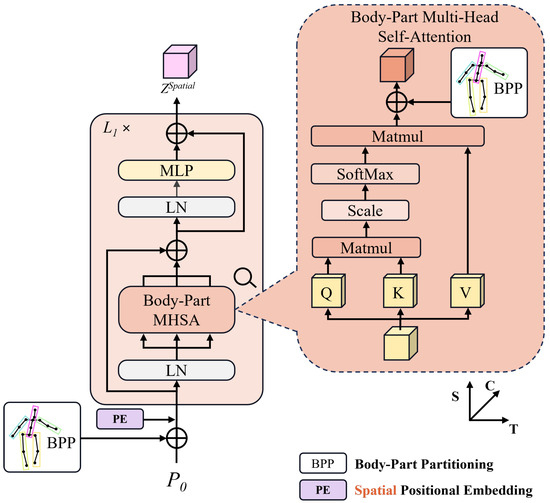 We encode these five sets of joints (, , , , and ) using a learnable dictionary and transform them into body embedding vectors, which is a process termed Body-Part Partitioning (BPP). We apply BPP in two components based on the vanilla spatial encoder. First, before the integration of a learnable spatial positional embedding into the spatial encoder (Figure 2), the introduction of BPP is essential to impose constraints on human motion representations based on body parts external to the encoder. Secondly, BPP is integrated within a multi-head self-attention mechanism, named BpMHSA (Figure 2), to enhance connections among fine-grained features. The output of the spatial encoder with layers is .