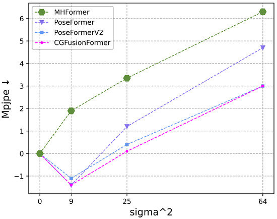 Comparison of robustness between CGFusionFormer and other methods on Human3.6M. We add zero-mean Gaussian noise with varying standard deviations to ground truth 2D detection, comparing the performance drop (, in mm) as increases.