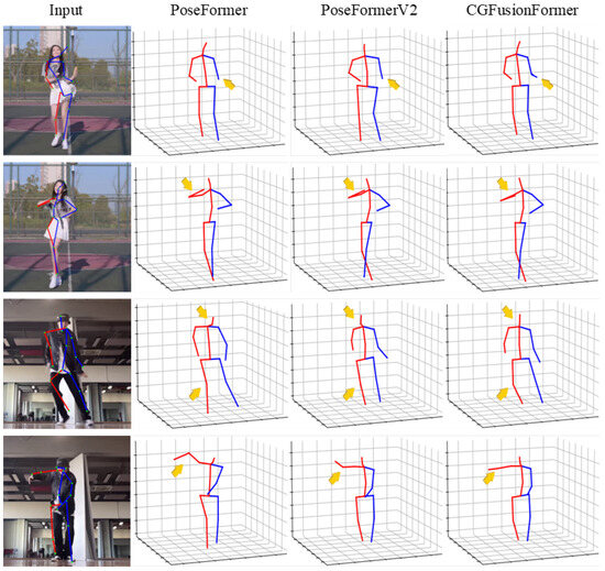 Complementing these quantitative findings, Figure 6 presents qualitative comparisons to assess the robustness of 3D pose predictions under noisy 2D detections. We inject Gaussian noise into the 2D joints (with the same protocol as in Figure 5) to mimic detector drift. For fairness, all methods take 81-frame input sequences. We observe that CGFusionFormer produces more accurate and physically plausible poses, as emphasized by the annotated arrows, especially for peripheral joints (hands and feet) and the head. Compared with PoseFormer [17] and PoseFormerV2 [19], these improvements are consistent with the gains attributed to our CSR and upport the robustness indicated in Figure 5.