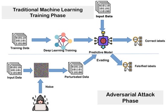 In addition to poisoning, adversarial examples also threaten AI-based systems. By making small, carefully designed perturbations to input data, adversaries can cause even well-trained models to misclassify traffic. Such examples exploit the sensitivity of machine learning decision boundaries and are often transferable, meaning that an attack crafted for one model can deceive another, even when the models use different architectures or training methods. This property increases the risk of real-world exploitation. Attackers may not need full access to a target model in order to mount a successful attack.