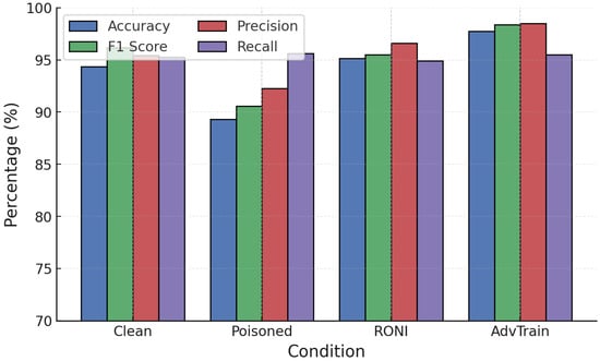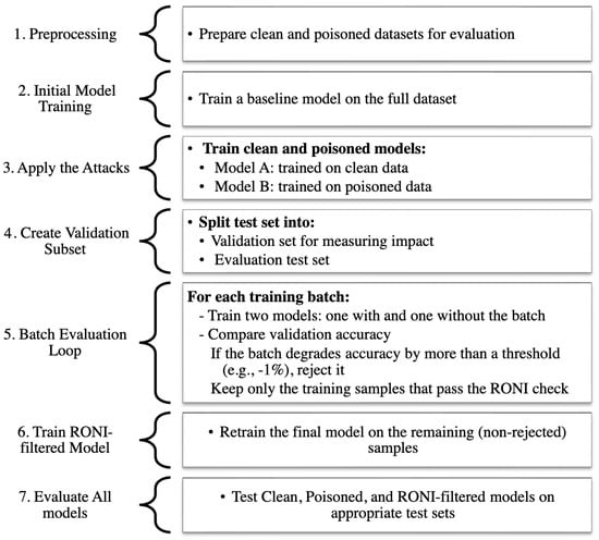 - RONI: this defense checks whether a training sample harms model performance. For a candidate sample , the model is compared when trained with and without , and the performance change is measured as Equation (4):If the change is below a negative threshold, i.e., Equation (5), then is considered harmful and is removed:This means RONI filters out data points that reduce the effectiveness of the model. By discarding such samples, the final model becomes more resilient to poisoned or misleading data. Figure 2 illustrates the hierarchical workflow of the RONI defense mechanism.