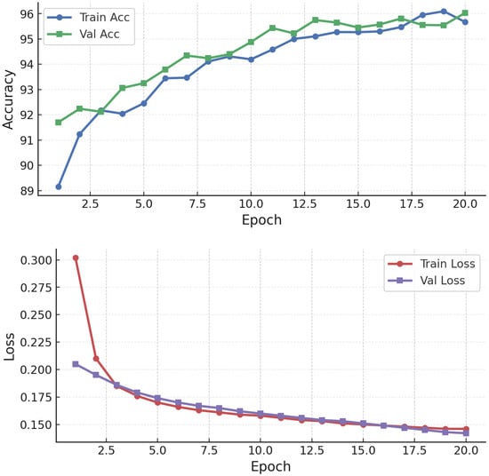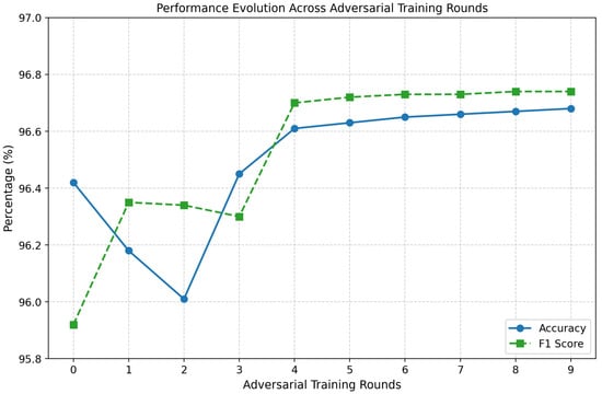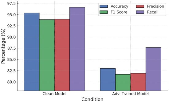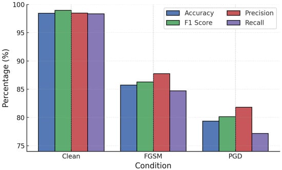 PGD was configured with the norm, , step size , and iterations (see Algorithm 1). These values follow common configurations reported in adversarial machine learning literature [,]. They were fixed across experiments to ensure comparability rather than to maximize attack success.