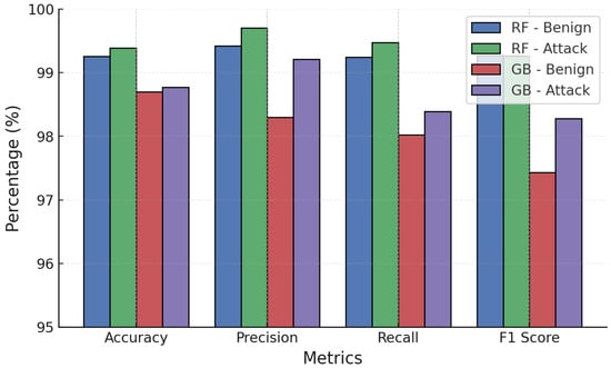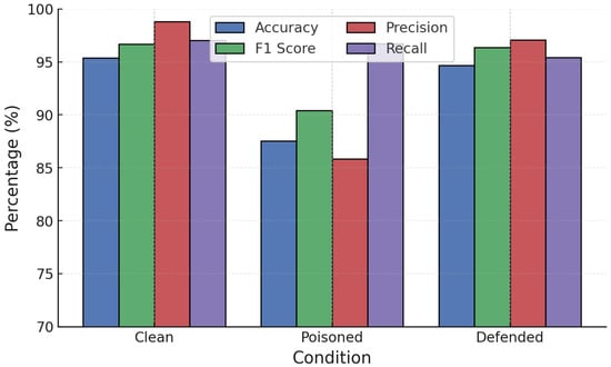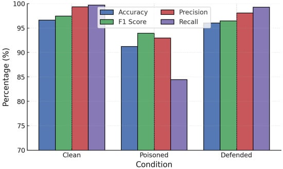 Several defenses have been explored. Data sanitization, defensive data augmentation, and anomaly detection have shown partial success, restoring accuracy by 15–20% in poisoned settings [,,,]. Ensemble approaches that combine RF, GB, or XGBoost models have improved resilience by reducing error rates and mitigating accuracy degradation under adversarial conditions [,,].