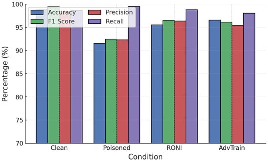 For random poisoning attacks, however, adversarial training was more effective than RONI. Since these attacks modify feature distributions without consistently corrupting labels, adversarial retraining helped the model adapt to perturbed inputs and maintain high accuracy (above 99%). In contrast, RONI filtering could only partially restore performance, as poisoned samples blended into the feature space without being detected as clear outliers. This highlights a fundamental limitation of filtering defenses when adversarial perturbations mimic normal variation.