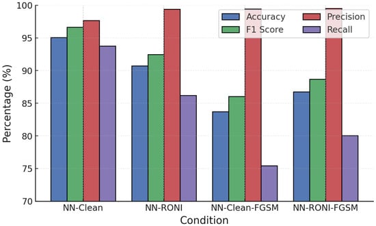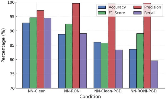 For NN, RONI was applied as a training-time filter on candidate samples, including both clean and adversarially augmented data. The purpose was to discard training points whose inclusion degraded validation performance beyond the threshold , rather than applying RONI at inference time. NN models were also evaluated with RONI filtering under FGSM and PGD. Figure 11 and Figure 12 show that while adversarial samples degraded accuracy sharply (to 83–86%), RONI filtering restored 2–3% of lost accuracy and reduced FPR to nearly zero, maintaining precision close to 100%.