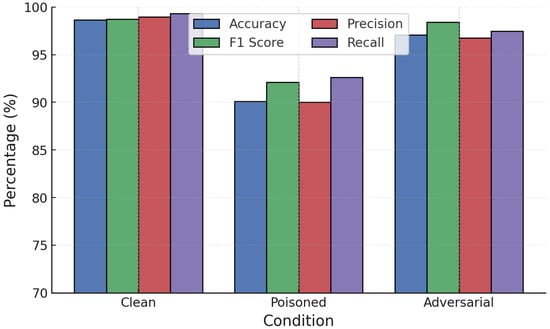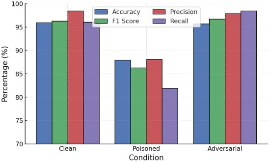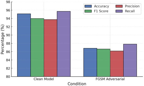 - Accuracy, precision, recall, and F1-score measure detection under clean and adversarial conditions.