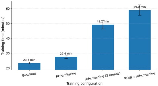 Figure 18 shows that RONI adds ∼4.2 min (+18%) over baseline, adversarial training increases time to ∼49.1 min (≈2.10×), and the combined configuration totals ∼59.0 min (≈2.52×).