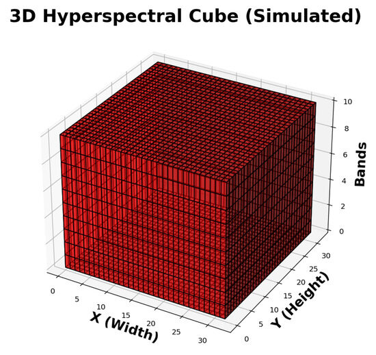 Figure 5 shows the original RGB image alongside two bands of the simulated hyperspectral cube, while Figure 6 presents a 3D representation highlighting its spatial–spectral structure.