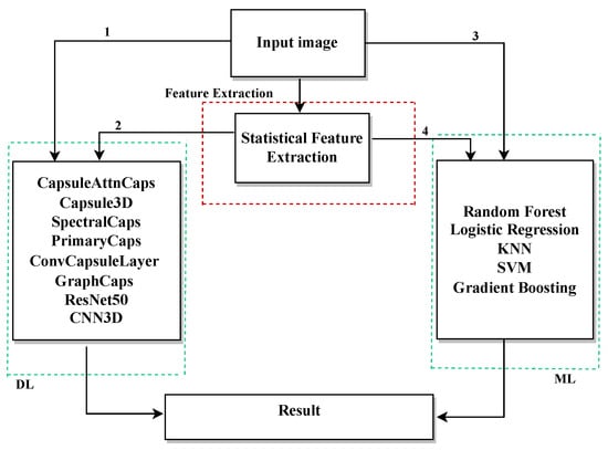 In the Dataset Original, applying classical ML models directly to raw images yielded moderate performance due to the high dimensionality and complexity of the data. For example, RF achieved approximately 88.85% accuracy. However, incorporating extracted and selected parameters significantly improved performance. DL models, including ResNet50 and capsule-based architectures, achieved results above 98% in accuracy and F1-score, confirming that enriching latent representations with statistical descriptors improves robustness and class discrimination.