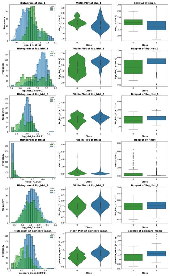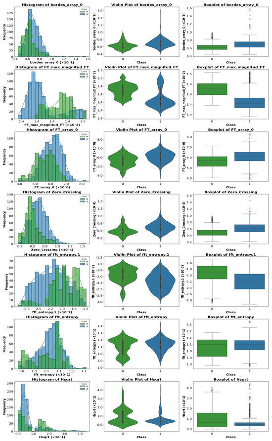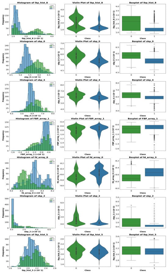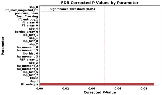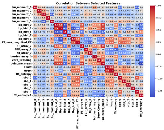 For each image in the dataset, a comprehensive set of descriptors was calculated, covering multiple domains, including statistical, texture, shape, frequency, entropy, and complexity, in both spatial and transformed domains (frequency and multiscale). The initial set contained approximately 130 parameters, a number chosen to capture the maximum information present in the images. Many descriptors include multiple variants or are summarized through statistics, considering different distances, angles, or regions, ensuring a rich representation of the patterns in the data before any selection process.