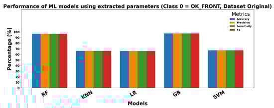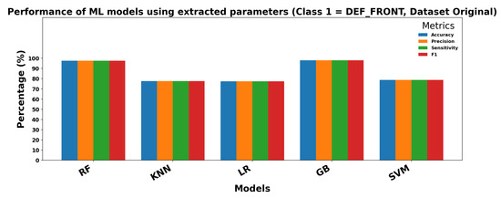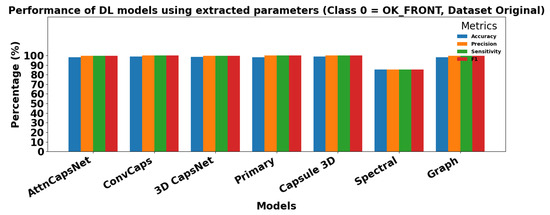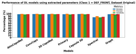 Figure 15 and Figure 16 show the performance of DL models using extracted parameters on the Dataset Original for Class 0 (OK_FRONT) and Class 1 (DEF_FRONT), respectively. Metrics include Accuracy, Precision, Sensitivity, and F1 score, demonstrating very high performance for both classes.