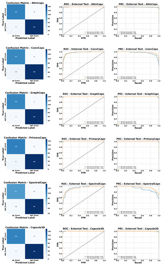 Figure 17 presents a visual evaluation of the DL models’ performance using combined inputs (images + extracted parameters). Confusion matrices (CM), ROC curves, and Precision-Recall (PRC) curves are shown for all evaluated Capsule architectures.