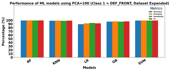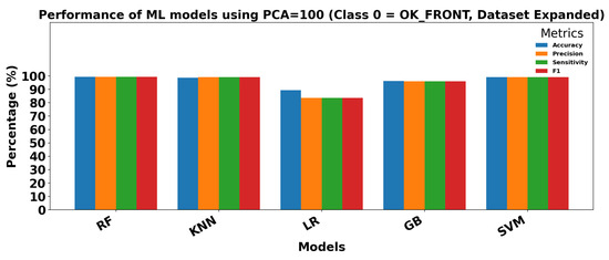 Figure 18 and Figure 19 show the performance of ML models on the Dataset Expanded (Data2) for Class 0 (OK_FRONT) and Class 1 (DEF_FRONT), respectively. Metrics include Accuracy, Precision, Sensitivity, and F1 score, demonstrating high performance with PCA = 100.