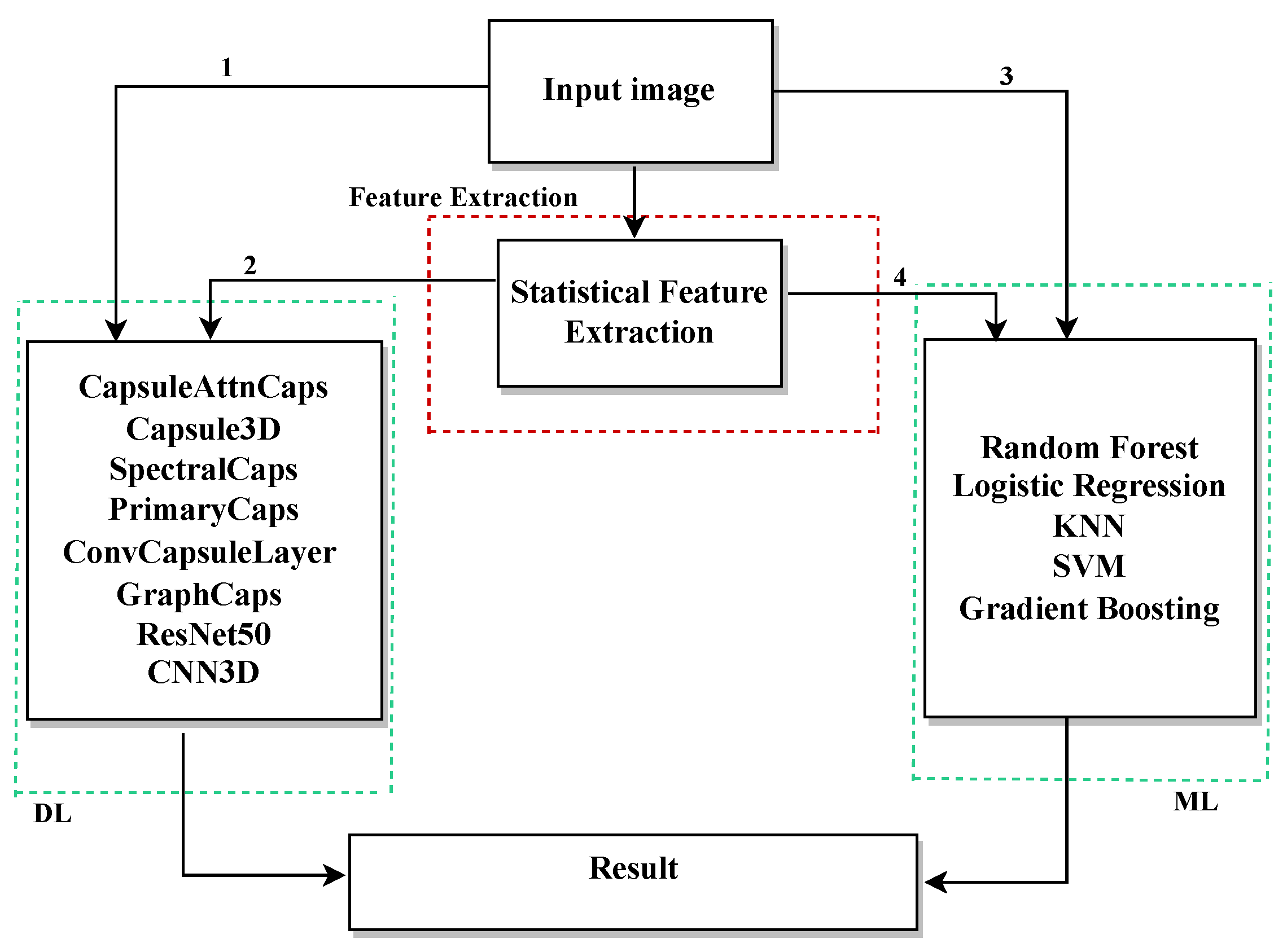 - Path 4: Statistical features are extracted from images and then used as input for the same set of ML classifiers.