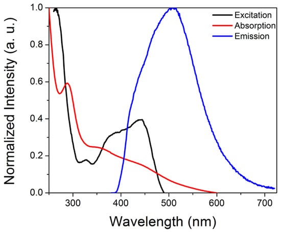 Representative absorption (red), excitation (black) and emission (blue) spectra of the iron-responsive CDs.