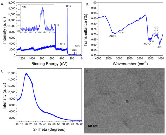 Physical characterization of the CDs. XPS survey spectrum of the CDs (A), with an inset showing the high-resolution weak P 2p spectrum. Si signal is from the glass substrate. FTIR-ATR transmission spectrum (B) illustrates the major functional groups on the CDs. The XRD pattern for the CDs is shown in (C). A representative HRTEM image (D) demonstrates pseudospherical morphology with sub-10 nm diameters.