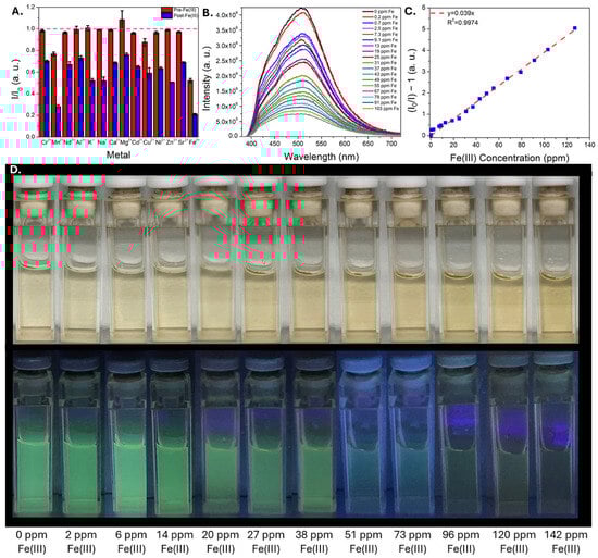 The CDs were then screened for their ability to detect metal ions by monitoring their optical properties in the presence of some of the most common metals in coal utilization byproduct streams. Among the metals tested, iron ions induced the most significant change, selectively quenching CD emission when introduced (Video S1), which is consistent with previous reports on m-phenylenediamine-derived CDs synthesized using solvothermal methods [37,40]. Selectivity studies were conducted (in triplicate) in which changes to CD emission properties were measured before and after exposure to (a) a potentially interfering metal, then (b) iron added to the same solution. These results indicated that the CDs exhibit good selectivity for iron without significant interference from other common metals in coal utilization byproduct streams (Figure 3A). Although both iron(II) and iron(III) induced appreciable quenching, sensing metrics were benchmarked using iron(III) due to its prevalence in coal utilization byproduct streams [49]. Sensitivity tests were then conducted in which the quenching of CD emission was monitored as a function of iron concentration; these experiments were conducted in both deionized water (Figure 3B–D) as well as 0.1 M HCl (Figure S2) to determine how well the sensor can function in acidic environments that would likely be encountered in metal processing streams. Remarkably, the limit of detection values in both matrices were very similar: 0.5 ± 0.1 ppm was estimated in both conditions, implying that acidic conditions do not significantly hinder the ability of the CDs to detect iron. Taken together, these results indicate that the Fe-responsive m-phenylenediamine solvothermal reaction is adaptable to an acid–base mediated synthesis, a promising step for improving scalability and reducing the time and financial costs associated with material synthesis.