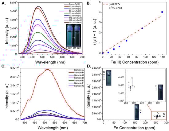 Representative data illustrating the response of the CDs to Fe(III) ions using the portable platform are shown in Figure 5. The characteristic green emission band of the CDs is quenched with increasing iron concentration (Figure 5A), exhibits a linear Stern-Volmer profile up to at least 600 ppm Fe(III) (Figure 5B), and, when monitoring the peak area over time, the emission responds almost instantly upon Fe(III) addition. The linear dynamic range achieved using the portable set-up was longer than that achieved using a commercial instrument; we have observed this previously using a carbon dot sensor [16] and attribute this in part to the use of a weaker excitation source, a factor that has been reported to increase the linear dynamic range [54]. Other factors may include different excitation and emission collection paths in the portable set-up [55], and/or the use of less pure sensing material. A limit of detection of 2.2 ± 0.3 ppm Fe(III) was determined from three independent trials in water. Subsequent analyses of the limit of detection of Fe(III) in a pH 1.68 buffer (Figure S5), representing an acidic, high-ionic-strength matrix, yielded a similar detection limit of 2.83 ± 0.06 ppm, demonstrating that the sensing material remains functional in acidic matrices even with minimal purification.