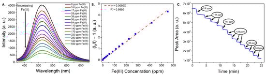 Representative emission spectra (A) of CDs in water exposed to increasing concentrations of iron(III) nitrate, recorded using a portable fiber optic sensor. (B) The corresponding Stern-Vomer plot used to estimate the limit of detection for iron(III). (C) Plot of emission peak area as a function of time, where different amounts of iron(III) are added. An immediate drop in emission intensity is noted upon each iron(III) addition.