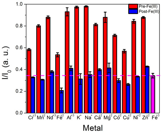 Plot of CD intensity change after adding a potentially interfering metal (red bar) followed by the addition of iron(III) (blue bar), measured using the portable fiber optic spectrometer with CDs that underwent minimal purification. A dotted line is included at the quenching levels observed when iron(III) alone is added (signified by the pink bar) to compare the effects of iron(III) alone versus iron(III) added in the presence of other metals.