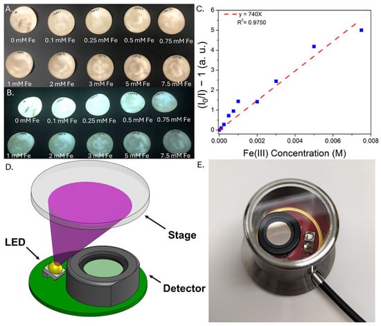 CD-coated filter paper exposed to increasing concentrations of iron(III) nitrate in water under ambient (A) and 365 nm (B) lighting, indicating quenching of the emission as a function of iron concentration. (C) corresponding Stern-Volmer plot of quenching recorded on the test strips using a commercially available film analyzer. A schematic of the Fluid Photonics Quick Strip analyzer is shown in (D), along with a photograph of the device (E).
