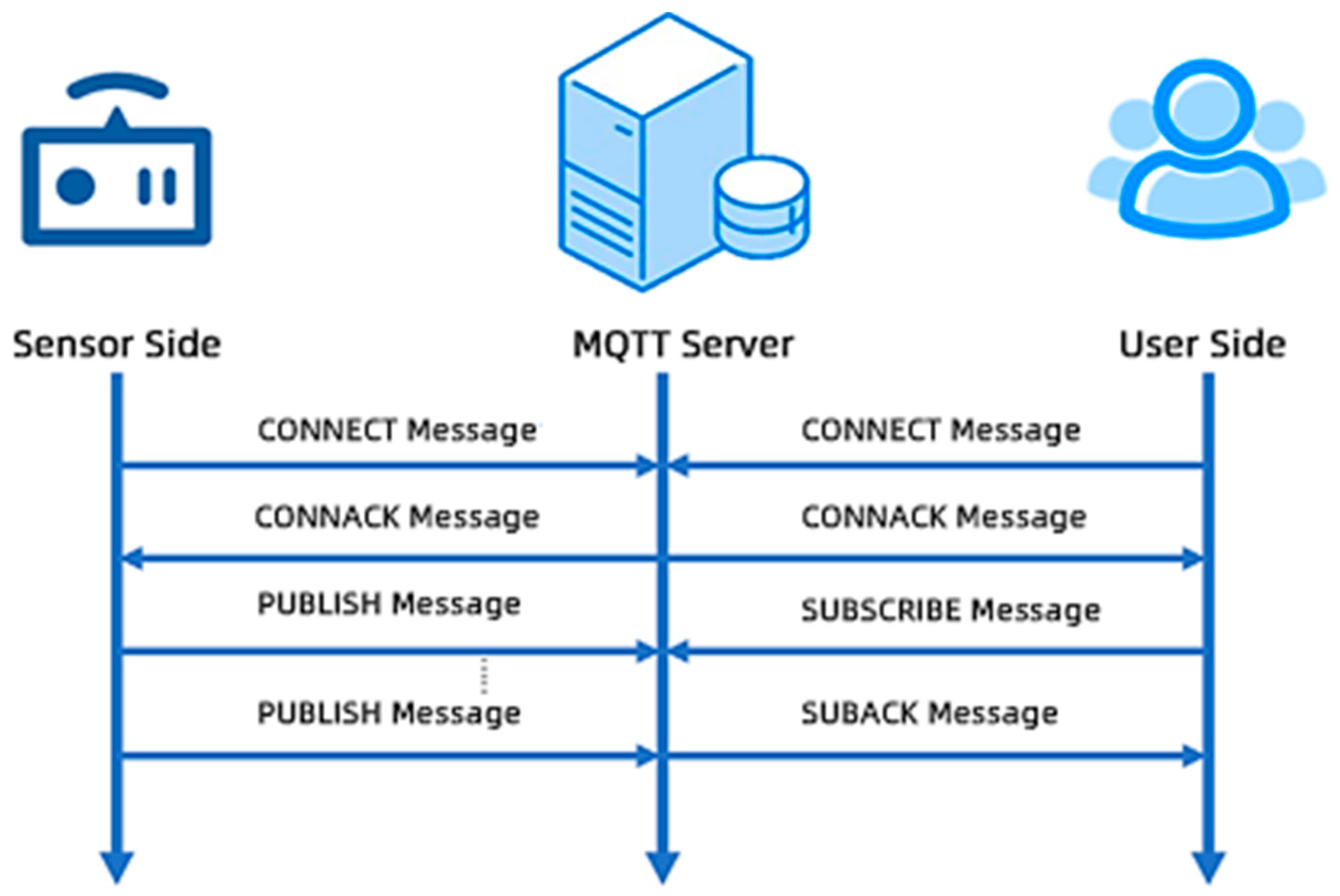 Step 1: Sensors establish a connection with the MQTT server using the CONNECT message and receive the CONNACK message to confirm the connection. Subsequently, the sensor end utilizes the publish-retransmit mechanism to send data to the server via the PUBLISH message.