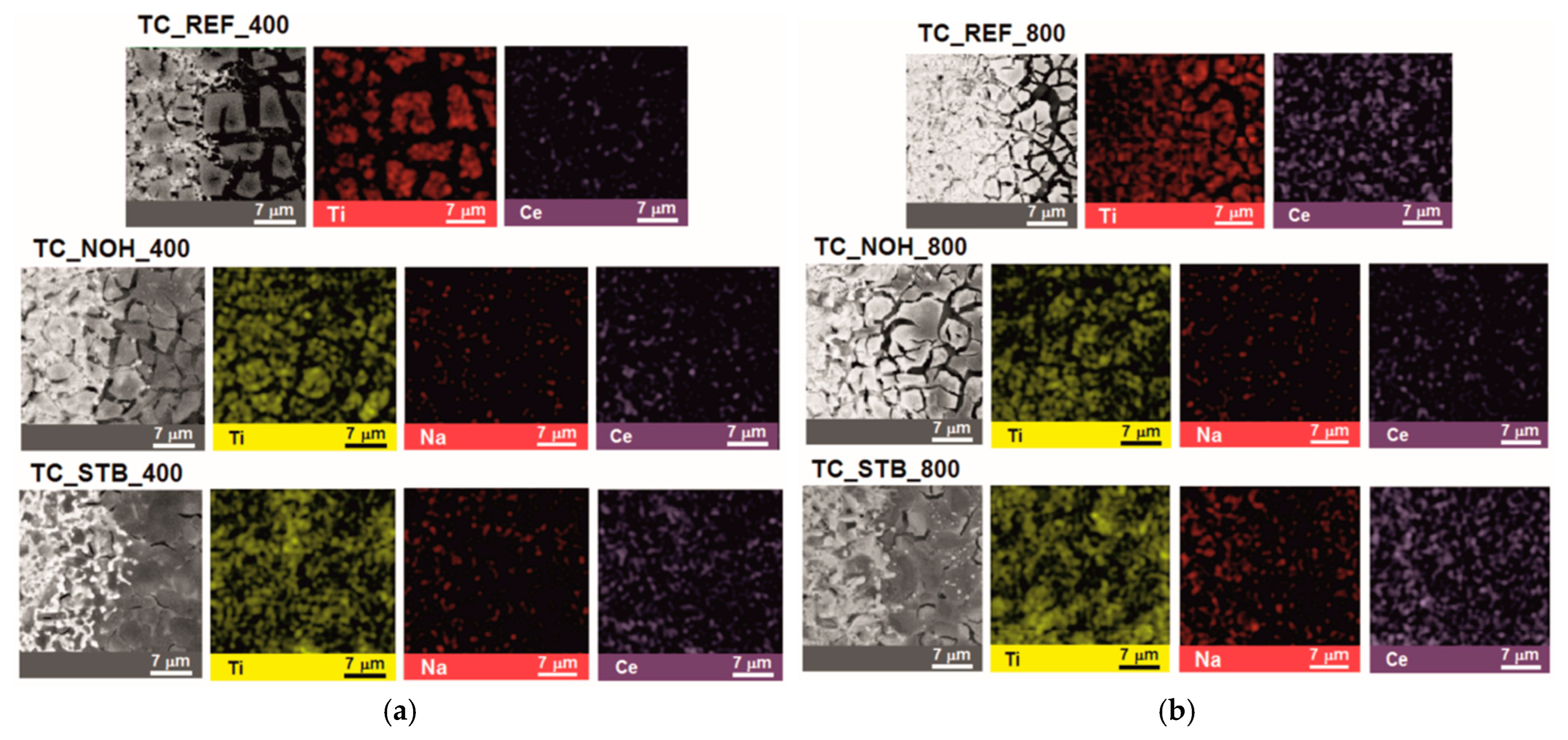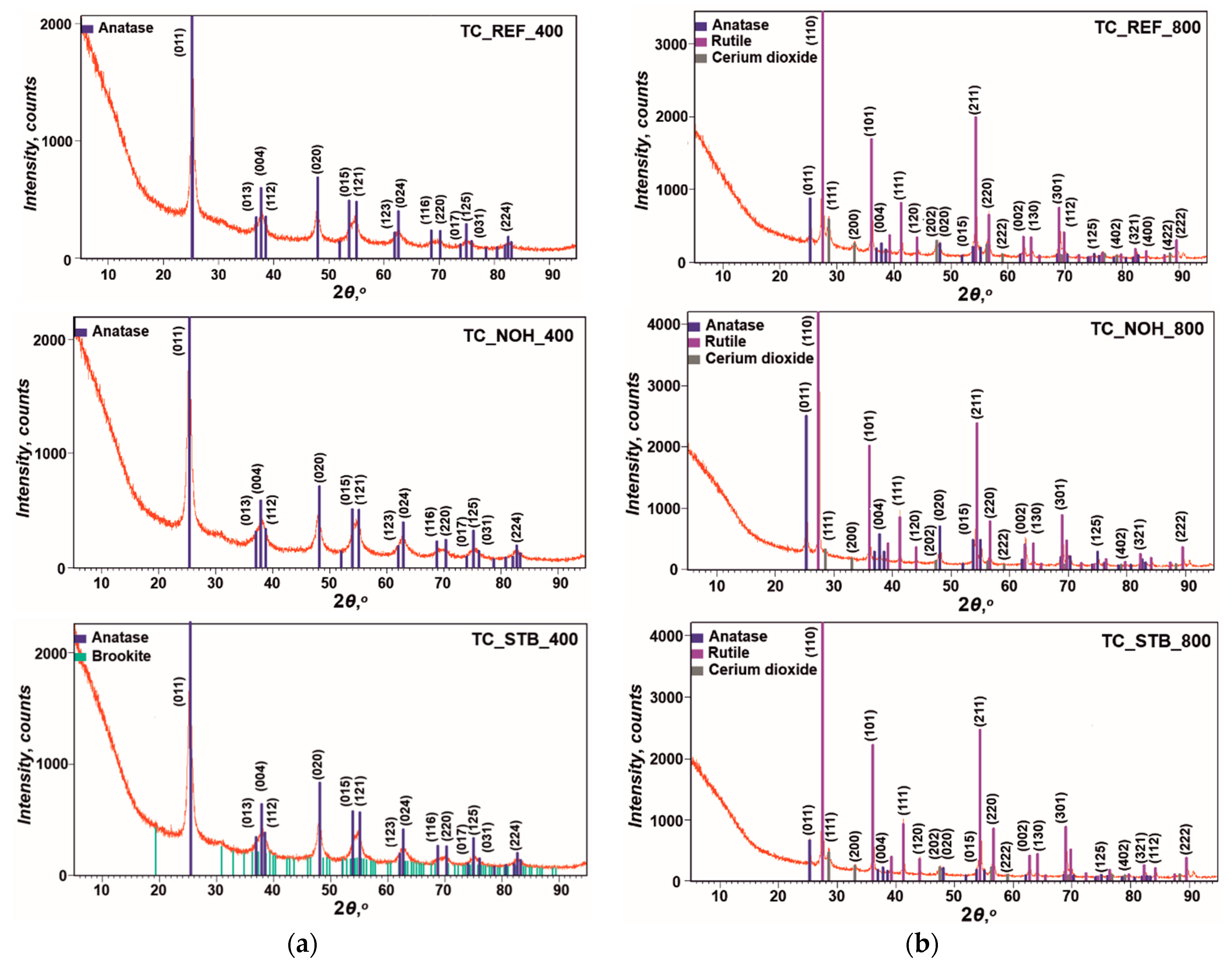 - For samples, sintered at 800 °C: TC_REF_800—anatase 31.8 nm, rutile 69.1 nm, and cerium dioxide 56.1 nm; TC_NOH_800—anatase 53.2 nm, rutile 93.8 nm, and cerium dioxide 43.9 nm; TC_STB_800—anatase 132.4 nm, rutile 89.8 nm, and cerium dioxide 25.7 nm.