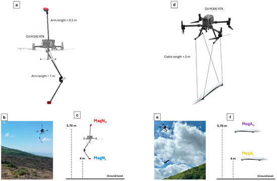 Flight configuration systems proposed for drone-borne magnetic survey. (a) MagNimbus-based configuration with sensors rigidly fixed to the DJI M300 RTK (manufactured by DJI Sciences and Technologies Ltd., Shenzhen, Guangdong, China); (b) MagNimbus-based system after the take-off and (c) the related survey details for the vertical gradient computation; (d) MagArrow-based configuration with the magnetometer suspended below a DJI M300 RTK drone; (e) MagArrow-based system after the take-off and (f) the related survey for details for the vertical gradient computation.