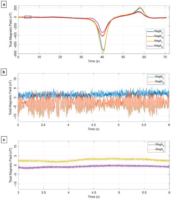 A closer inspection of the recorded signals reveals the presence of high-frequency noise in the dataset with amplitude depending on the distance between sensors and drone (Figure 2b,c). Indeed, MagNU placed only 0.5 m from the drone shows oscillations with maximum amplitude of about 10 nT, while MagNL, placed 1 m from the drone, exhibits noise with a lower maximum amplitude of 5 nT. On the other hand, both MagAL and MagAU, located at a distance of 3 m from the drone, show negligible noise, with maximum amplitudes below 1 nT. Therefore, the high-frequency and high-amplitude noise can be attributed to the magnetic and electromagnetic interference fields generated by the UAV platform. As demonstrated by Walter et al. [35], UAV produces sources of magnetic and electromagnetic interference signals, with the latter being proportional to the rotation frequency of the electromagnetic motor. However, at a separation distance of 3 m, the magnetic field generated by a DJI M300 RTK drone (DJI Sciences and Technologies Ltd., based in Shenzhen, Guangdong, China) appears to be sufficiently attenuated. Previous studies regarding the optimal distance between the magnetometers and UAV confirm this observation [18,35].
