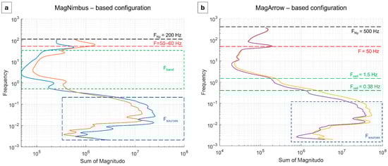 The first and most evident spectral peak is around 50 Hz (F and red dashed lines in Figure 3). In the case of the MagNimbus-based one, this frequency can be interpreted as being due to the magnetic and electromagnetic fields generated by the UAV platform. Indeed, this peak has a greater amplitude in MagNU, which is the sensor closest to the drone, than MagNL. In the case of the MagArrow-based configuration, given the 3 m distance, the 50 Hz frequency is due to the presence of alternating fields generated by the AC power lines in the area.