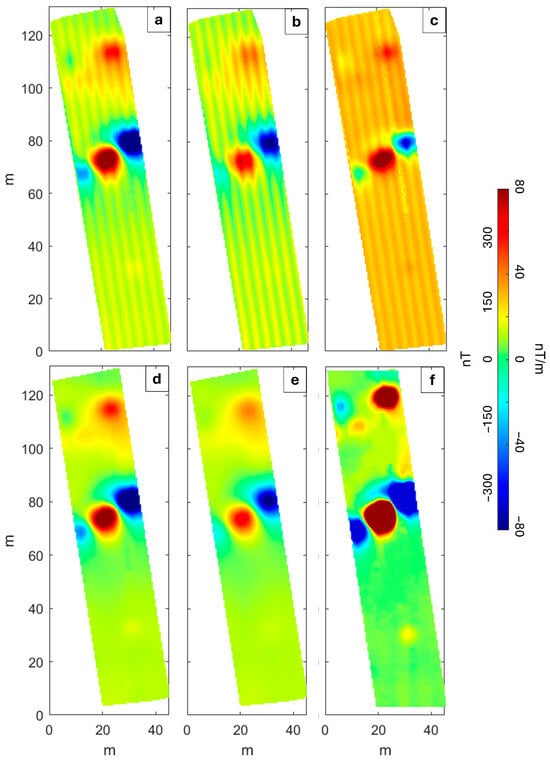 The main difference between the datasets collected with the two systems is that the MagNimbus-derived maps (Figure 4a–c) are characterized by a strong heading error, which depends on the variation in the orientation of the sensors during the flight and is caused by the bi-directional flight mode (South–North and North–South along adjacent lines). This error can be recognized from the different mean values of the field among the adjacent flight lines. In fact, the MagNimbus magnetometer is used in conjunction with an altimeter, which is mounted at a slight angle on the front of the drone to look forward. This setup requires the system to rotate completely between lines during data acquisition, causing a significant heading error. In contrast, the MagArrow-based configuration uses a DTM instead of an altimeter, allowing us to keep the system’s yaw fixed during flight, thereby preventing heading errors. However, we note that even the vertical gradient obtained from the unfiltered MagArrow-derived data (Figure 5c) is affected by a directional noise, which appears different from the heading error. We associate this feature with the imperfect coincidence of measurement points coordinates between the two flights.