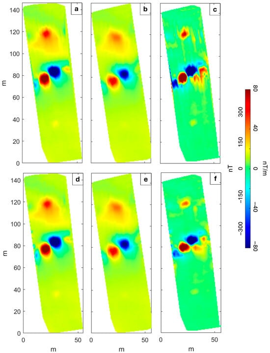 Total Field Anomaly maps from MagNimbus-based configuration. Un-filtered TFA maps retrieved from (a) MagNL, (b) MagNU and (c) related vertical gradient. Filtered TFA maps at (d) MagNL, (e) MagNU and (f) the related vertical gradient.