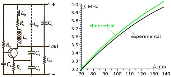 Figure 3 presents a schematic diagram of a Colpitts oscillator circuit with a split capacitance C1, C2 in the resonant circuit (see, e.g., [46,47,48]). The inductive component of the resonant circuit is the sensor under discussion. Additionally, the figure illustrates a typical relationship between the sensor length ls and the oscillation frequency of this circuit (the so-called transducer characteristic). The schematic also depicts parasitic inductances Lp and capacitances Cp of the sensor’s connections to the oscillator, as well as the sensor resistance Rs. The capacitor CL can in some cases limit the influence of temperature on the oscillation frequency; G0 represents the load conductance of the oscillator.